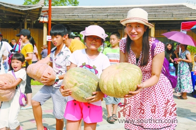 在清远阳山县省级新农村示范片元江村,国庆期间慕名而来的游客兴致勃勃地参与搬南瓜比赛。