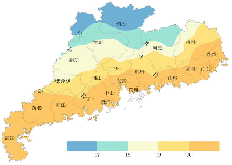 气温:全省月平均气温19.7℃,较常年同期偏高0.4℃。月平均气温分布(图1):北部偏北16.4~18.0℃,西南、东南大部20.0~21.8℃,其余大部分地区18.0~20.0℃。与常年同期相比,西北、中部、西南局部正常~偏低0.8℃,其余大部分地区正常~偏高1.0℃, 其中东南、梅州局部偏高1.0~1.9℃。月极端最低气温大部分地区出现在23~25日,西北大部、东北局部7.6~9.0℃,西南、东南大部12.0~14.2℃,其余大部分地区9.0~12.0℃。