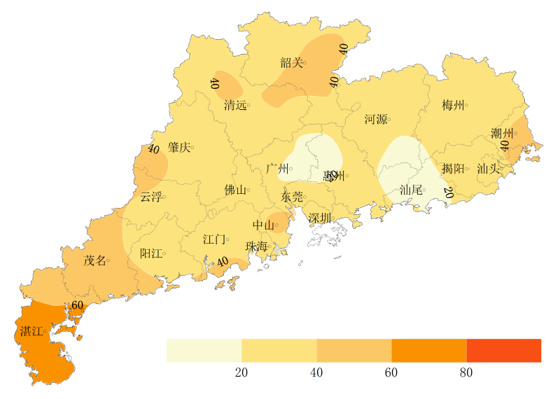上周(7月2~8日),全省平均气温28.7℃,较常年同期偏高0.3℃,粤东大部、珠三角局部地区26.7~28.0℃,其余大部分地区28.0~30.7℃(图1);全省平均累计降水量48.4毫米,较常年同期偏少1成多;全省平均累计日照时数35.5小时,较常年同期偏少2成多(图2)。