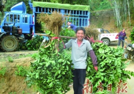黄岗村贫困户在工作队帮助下领取桂树苗,扩大种植规模。省扶贫办供图