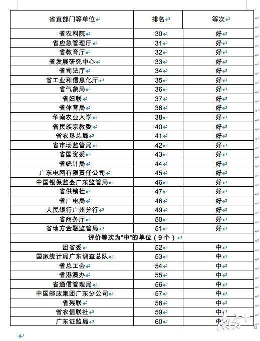 9个单位综合评价等次为“中”,分别是团省委、国家统计局广东调查总队、省总工会、省港澳办、省通信管理局、中国邮政集团广东分公司、省残联、省农信联社、广东证监局。