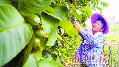广东金融扶贫带动众多贫困户脱贫致富。图为茂名信宜市丁堡镇山背村,贫困户赖方秀在查看刚挂果的番石榴。