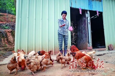 河源市柳城镇黄洞村,村民刘贵英在新建的房子附近喂鸡。